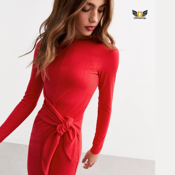 Red & Blue Tie Front Ribbed Mini Dress